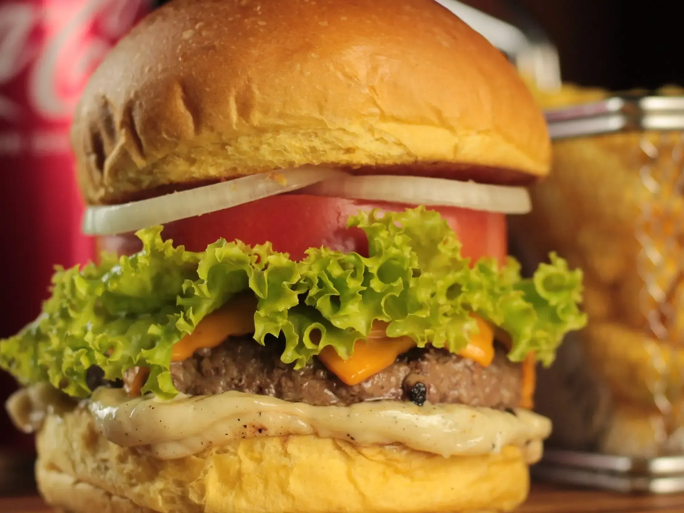 Experimente o incrível Tradicional Burger, um hambúrguer suculento de 180g com queijo cheddar, salada (alface, tomate e cebola) e maionese da casa, tudo isso em um delicioso pão brioche.