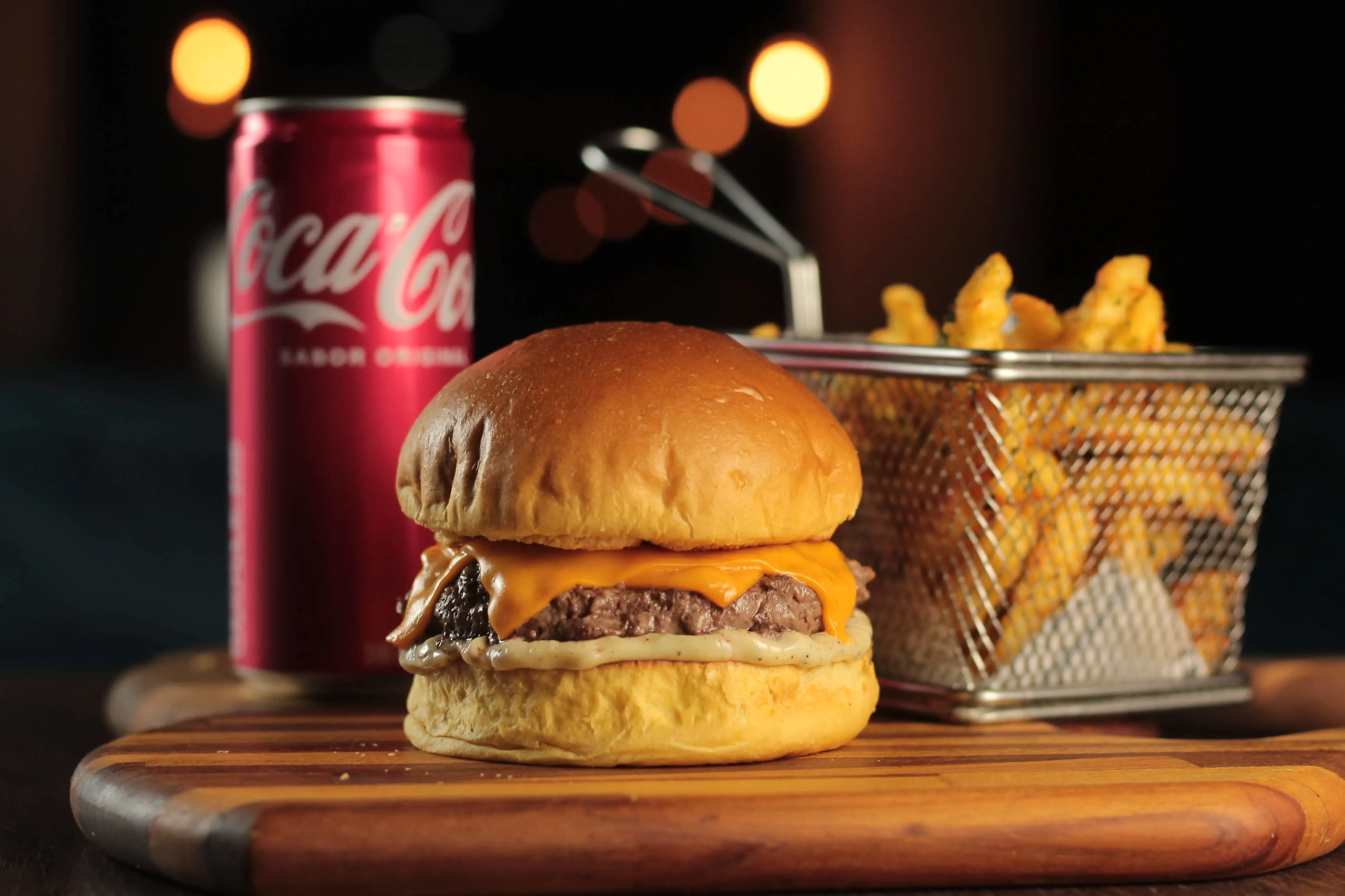 Experimente o incrível Tradicional Burger, um hambúrguer suculento de 180g com queijo cheddar, salada (alface, tomate e cebola) e maionese da casa, tudo isso em um delicioso pão brioche.